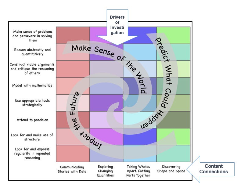 The relationship between content, mathematical practices and the drivers of investigation is highlighted in the diagram below: